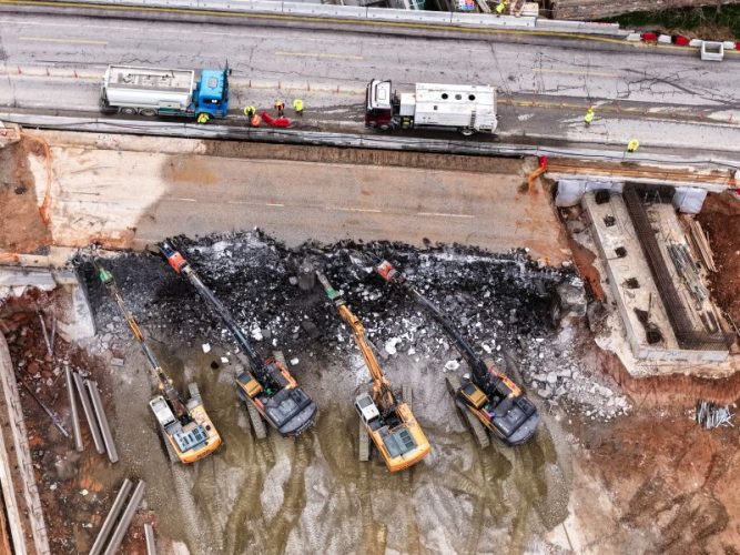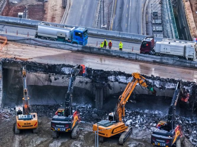 Λίγο πριν από τις οκτώ το πρωί ξεκίνησαν οι εργασίες κατεδάφισης της γέφυρας Πανοράματος στην Περιφερειακή Οδό Θεσσαλονίκης, με μπουλντόζες και ειδικά μηχανήματα να γκρεμίζουν τμήματα της κατασκευής. Οι εργασίες εντάσσονται στο πλαίσιο της κατασκευής του Flyover και για την ασφαλή εκτέλεσή τους, από χθες το βράδυ στις 23:00 έχει τεθεί σε ισχύ 48ωρος αποκλεισμός της κυκλοφορίας και στα δύο ρεύματα της Ανατολικής Εσωτερικής Περιφερειακής Οδού, στο ύψος του Ανισόπεδου Κόμβου Κ11 (Πυλαίας – Πανοράματος).