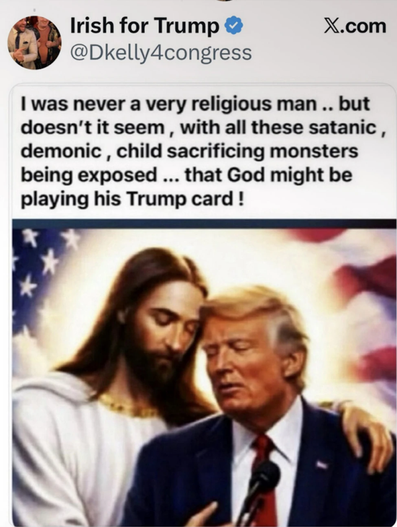 Η εικόνα, που αναδημοσιεύτηκε στον λογαριασμό του Τραμπ στο Truth Social, τον δείχνει με τα μάτια του κλειστά, να κλίνει την κεφαλή προς τον Ιησού. Ο Τραμπ στέκεται πίσω από ένα μικρόφωνο και πίσω του μια αμερικανική σημαία. Η αρχική ανάρτηση είχε τη λεζάντα: «Δεν ήμουν ποτέ ένας ιδιαίτερα θρησκευόμενος άνθρωπος… αλλά δεν φαίνεται, με όλα αυτά τα σατανικά, δαιμονικά, τέρατα που θυσιάζουν παιδιά να αποκαλύπτονται… ότι ο Θεός μπορεί να παίζει το χαρτί Τραμπ!»